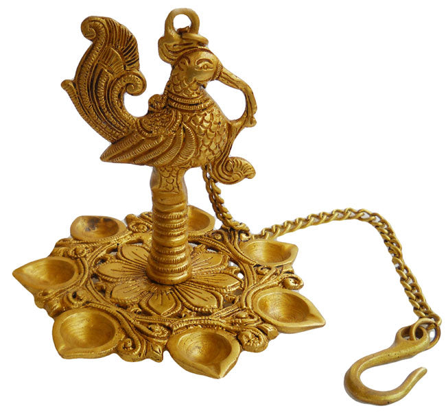 Crafts of India Hanging Peacock Diya with Six Lamps Brass Statu